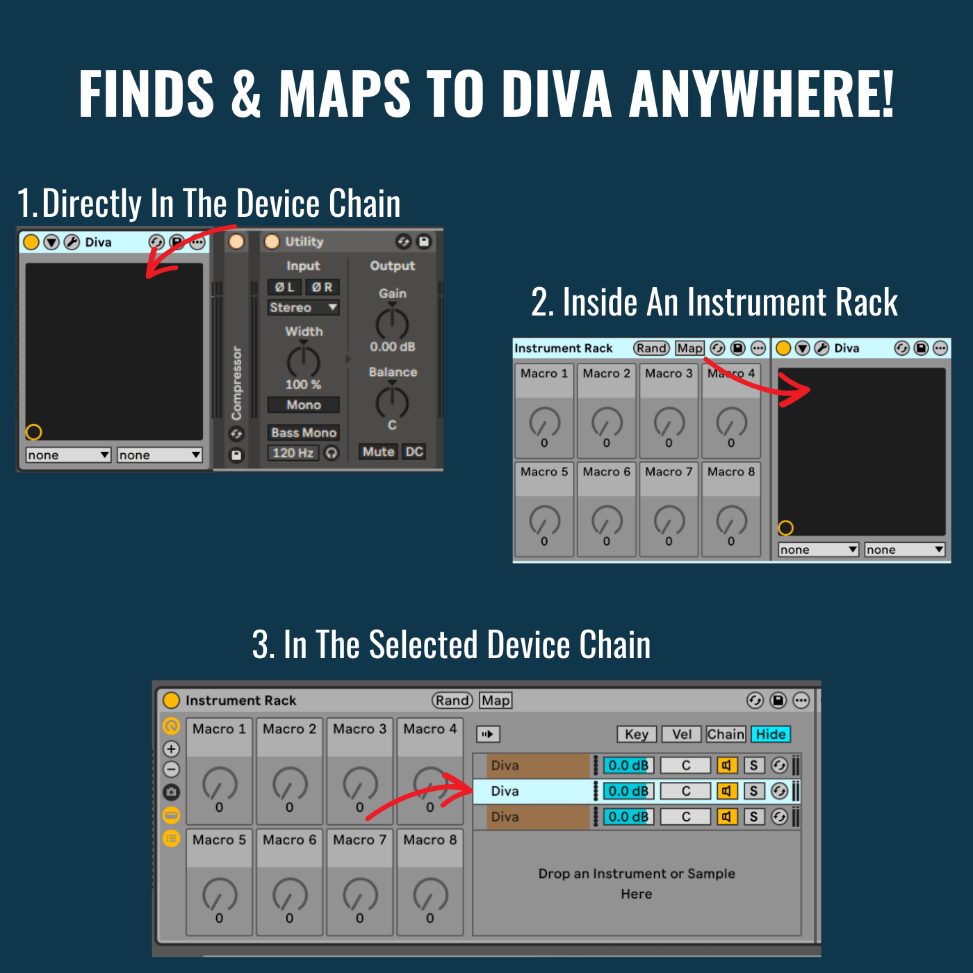 • Auto maps to Diva anywhere in the Ableton Live Device Chain.
