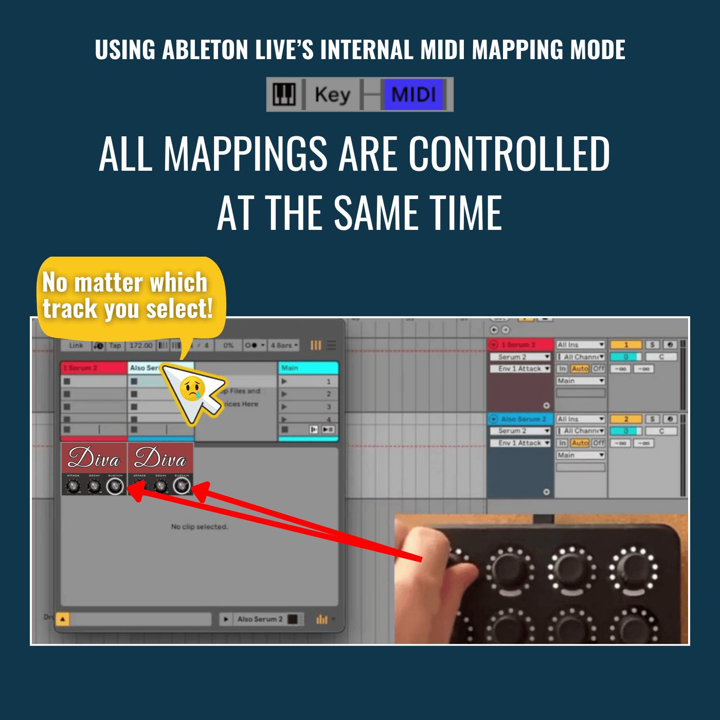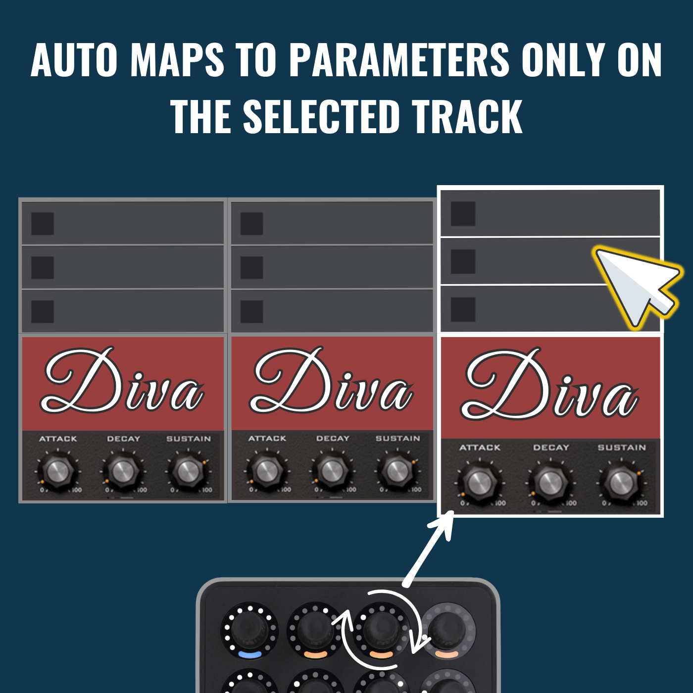 • Track selection doesn’t matter - if you map your Midi Fighter Twister to mulitple Diva instances, all mapped parameters will move together when turning the knob.