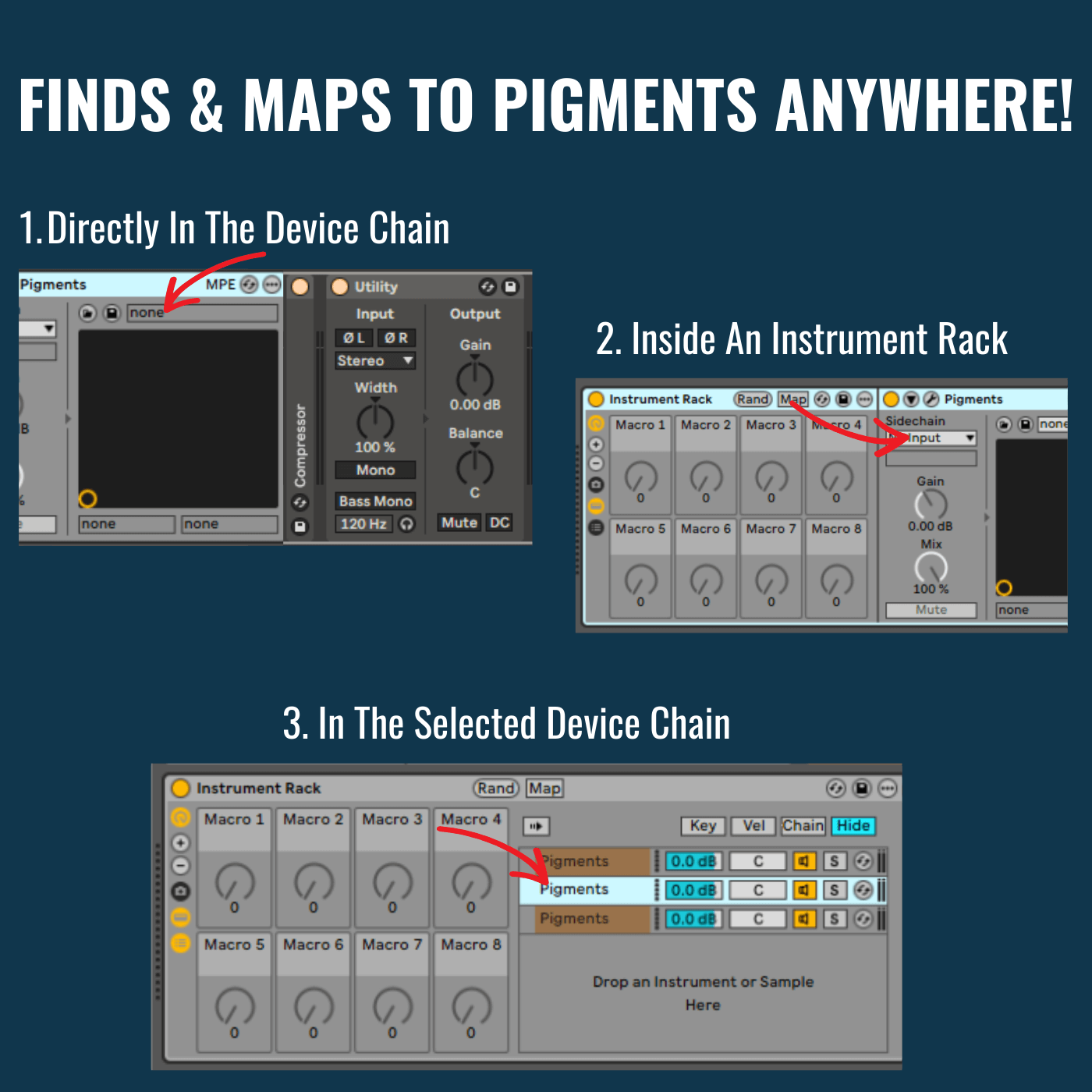 It automatically finds and maps to Pigments no matter where its located in the track's device chain.