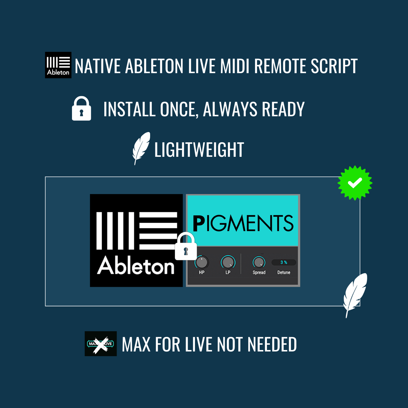 • Perfect when using multiple Pigments instances in your Ableton Live project – tweak one at a time without needing to re-map each time.
