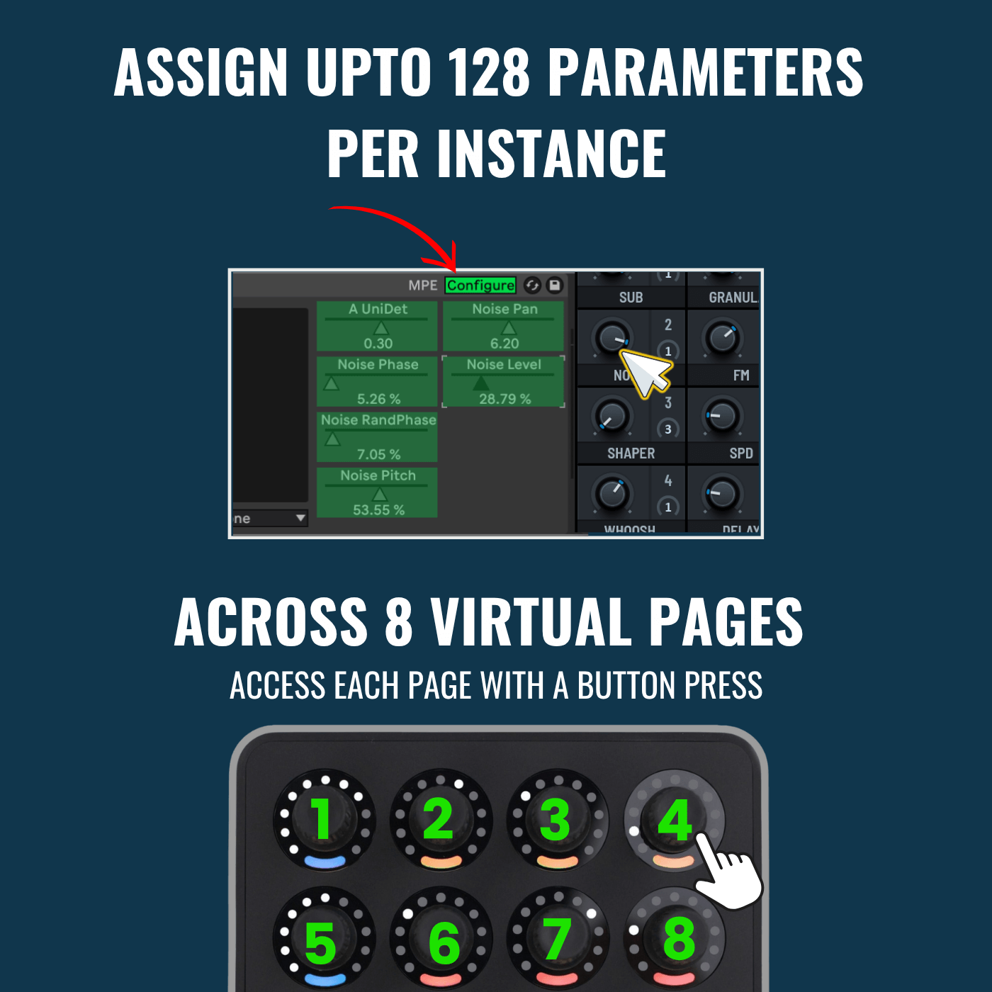 Parameters are automatically grouped into 8 virtual Midi Fighter Twister pages, each containing 16 parameters.