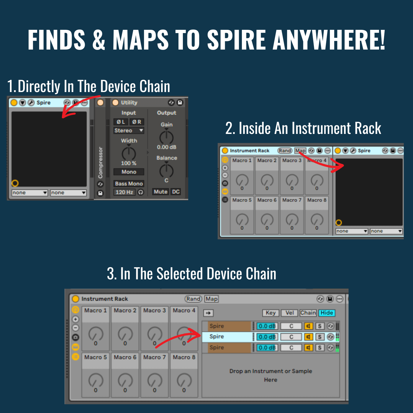 It automatically finds and maps to Spire no matter where its located in the track's device chain.